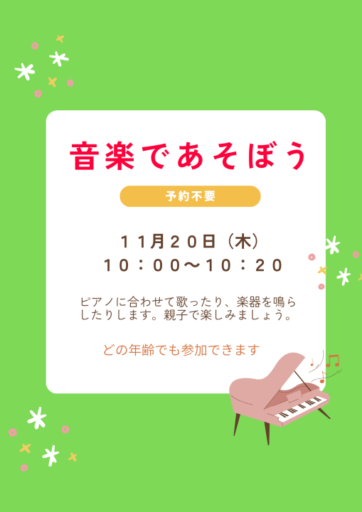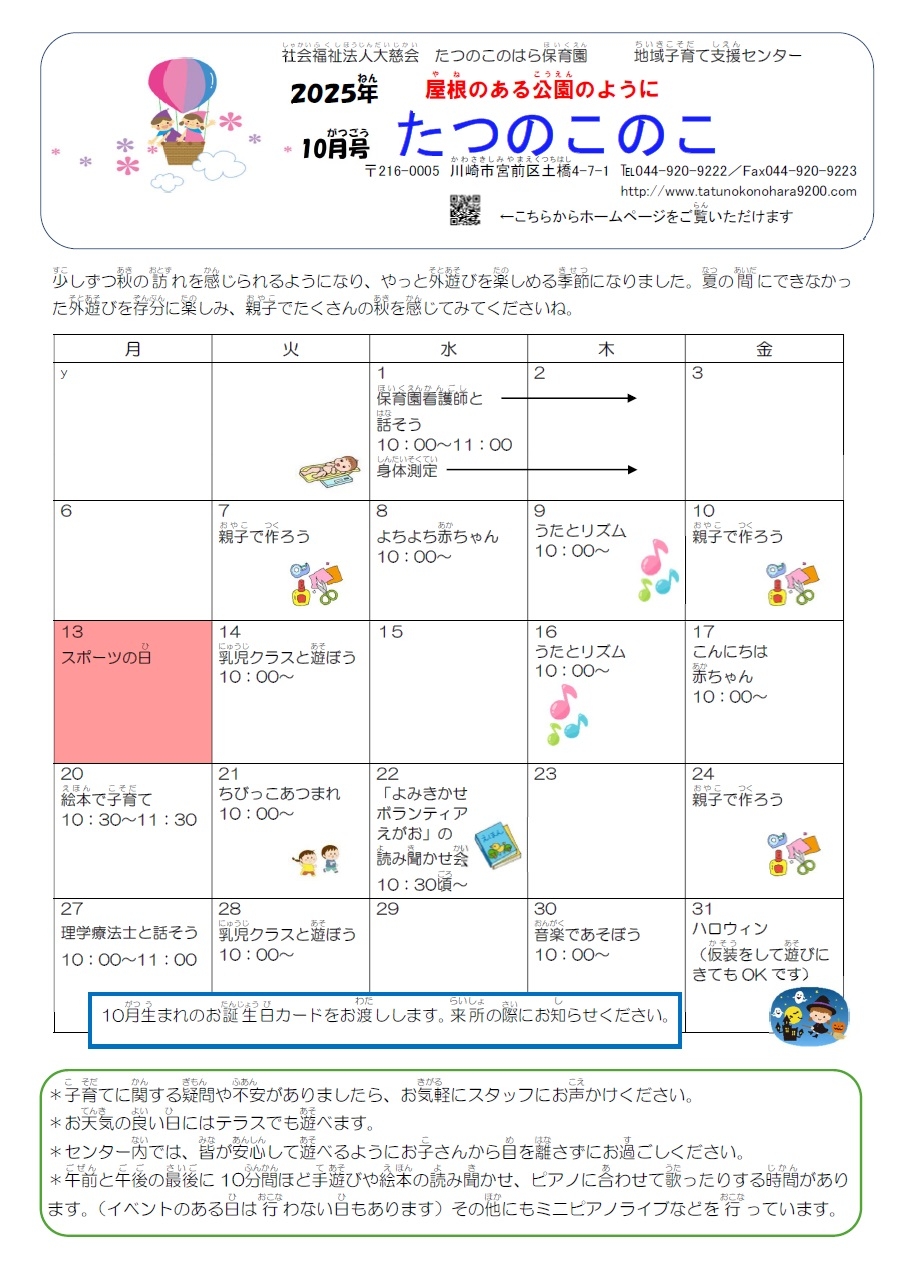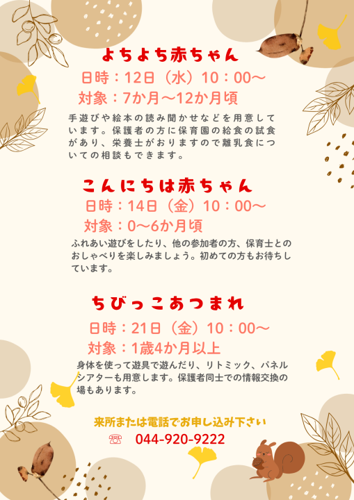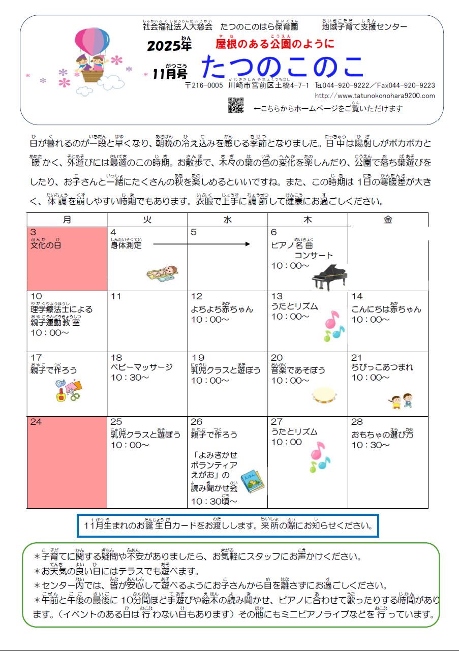 11月4日(火)午前は、保育園行事のため、利用できる駐車台数が制限されます。できるだけ、徒歩や自転車、公共交通機関のご利用をお願いいたします。ご迷惑をお掛け致しますがご協力をお願いいたします。
